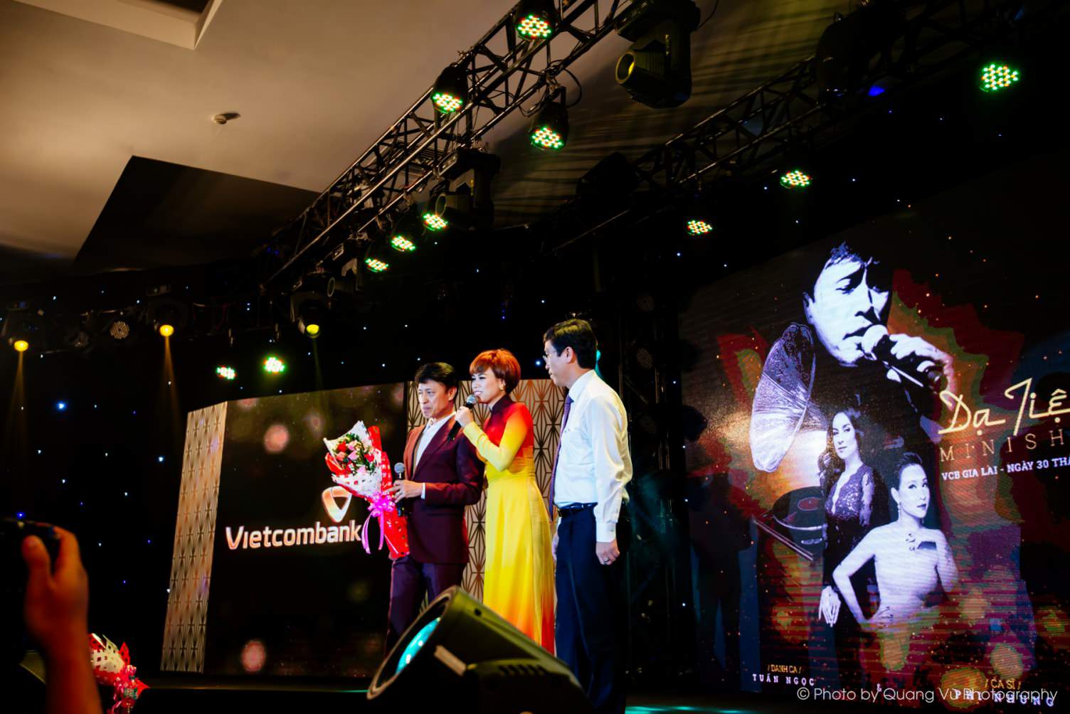 Vừa qua, mini show của danh ca Tuấn Ngọc với chủ đề "Đêm dạ tiệc tri ân" được tổ chức tại Gia Lai với 800 khán giả tham dự với sự đầu tư của Vietcombank Gia Lai. Mặc dù chương trình bắt đầu lúc 19h30 nhưng khán giả đã đến đông đủ lúc 19h để chờ theo dõi. Chương trình được dẫn dắt bởi MC Ngọc Vy - Á quân Gương mặt truyền hình 2017. Cô được khán giả ấn tượng ngay bởi gương mặt thân thiện và giọng nói truyền cảm và cũng rất đầu tư khi diện 3 bộ đồ của NTK Brian Võ. Cô tâm sự, đây là lần đầu tiên được nhận dẫn chương trình cho 1 danh ca mà cô vô cùng ngưỡng mộ từ bé, nên cô đã háo hức từ mấy tuần trước. Một điều thú vị, ngay từ khi xuất hiện trước khán giả cô bị nhiều người nhầm là ca sỹ Uyên linh, cả 2 cũng đều tự nhận thấy họ giống nhau như 2 chị em.
