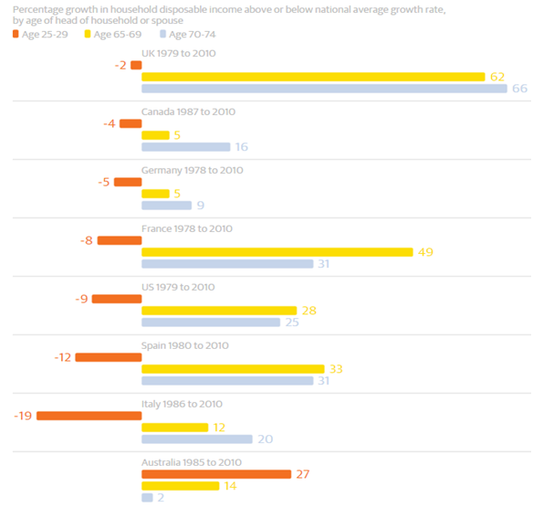 Như biểu đồ, có thể thấy rằng có sự giảm sút trong tốc độ tăng lương trung bình ở các thời kỳ. Thế hệ X có mức tăng chậm hơn hẳn thế hệ những người sinh ra trong chiến tranh (thế hệ “baby boomers” – những người sinh trong giai đoạn 1946 – 1964). Đến những người sinh trưởng vào năm 1981 - 1984 thuộc thế hệ Y (gia nhập thị trường lao động trước khi khủng hoảng diễn ra) thì hầu như không đón nhận bất cư sự tăng nào trong đồng lương trung bình (0%). Ông Torsten Bell, giám đốc của Resolution Foundation từng phát biểu rằng “Chênh lệch về thu nhập giữa các thế hệ đang dần trở thành một sự bất bình đẳng mới trong thời đại của chúng ta, và bằng chứng rõ ràng nhất chính là ở tiền lương” Điều tương tự với phần còn lại của thế giới Một cuộc điều tra khác của tờ The Guardian vào đầu năm 2016 này chỉ ra rằng chênh lệch thu nhập giữa các thế hệ không chỉ xảy ra ở Anh mà còn ở hầu khắp các nền kinh tế phương Tây. Dựa theo những số liệu từ LIS (Luxembourg Income Study), thì ở các nước này, những người ở thế hệ Y đang có thu nhập thấp hơn cả thu nhập trung bình của quốc gia nơi họ đang sống. Ngoại trừ Úc và bên ngoài Anh, thì người lao động trong độ tuổi từ 25 – 29 ở các quốc gia khác như Canada, Đức, Pháp, Mỹ, Tây Ban Nha, Ý đang có thu nhập thấp hơn trung bình khoảng 19% so với thu nhập trung bình quốc gia của họ. Ngược lại, ở tầng lớp những người hưởng lương hưu từ 65 -74, thu nhập của họ ngày càng tăng lên, với mức tăng vượt trội so với những người tuổi từ 25 – 29, dẫn đến mức chênh lệch thu nhập giữa các thế hệ ngày càng lớn.