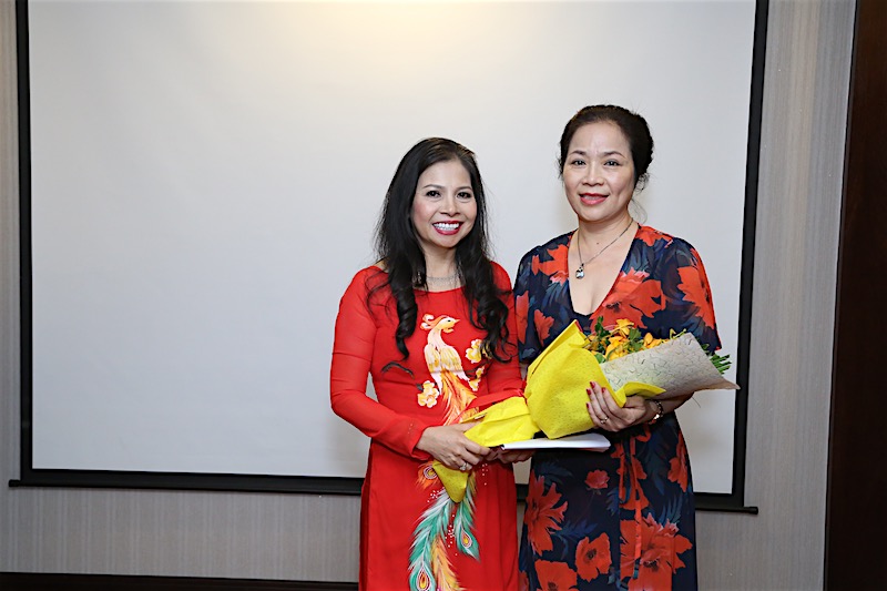 Bà Trương Thị Ngọc Ánh tặng hoa cám ơn bà Vũ Thanh Hải - Chi hội trưởng Chi hội Spa – Thẩm mỹ Việt Nam – Giám đốc Spa Hoàng Gia - Hà Nội đã đến dự và phát biểu tại sự kiện