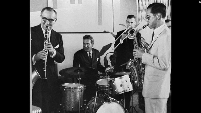 Nhà vua (ngoài cùng bên phải) chơi kèn saxophone trong buổi hòa nhạc với nghệ sĩ kèn clarinet nhạc jazz huyền thoại Benny Goodman và ban nhạc của ông tại New York năm 1960.