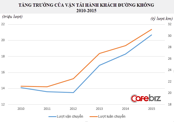 Theo số liệu từ Tổng cục thống kê, 5 tháng đầu năm 2016, tổng số khách đi máy bay đã tăng vọt lên 17 triệu lượt (tương đương tổng lượng khách cả năm 2013), tăng 30,9% so với cùng kỳ năm 2015.