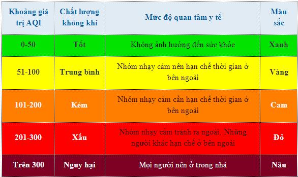 Khung cảnh Hà Nội chìm trong khói bụi nhìn từ trên cao. Để có thể biết được mức độ ô nhiễm không khí tại Hà Nội hay bất cứ thành phố nào trên thế giới, bạn có thể truy cập vào trang web: http://aqicn.org/. AQI (Air Quality Index) là chỉ số báo cáo chất lượng không khí hàng ngày. Thông qua chỉ số AQI tại thời điểm đó, mọi người có thể biết không khí bị ô nhiễm đến mức độ nào và nó ảnh hưởng trực tiếp đến sức khỏe của họ ra sao. Khi chỉ số AQI tăng lên, một phần lớn dân số sẽ dễ dàng gặp phải các tác động tiêu cực đến sức khỏe. Cơ quan bảo vệ môi trường Hoa Kỳ (EPA) tính toán chỉ số AQI với năm thông số ô nhiễm không khí chủ yếu là: Ozon mặt đất; Ô nhiễm phân tử (còn gọi là hạt lơ lửng); Carbon monoxide (CO); Sulfur dioxide (SO2) và Nitrogen dioxide(NO2), từ đó đưa ra bảng quy chuẩn đối với chất lượng không khí và lời khuyên đối với từng nhóm chỉ số như sau: Link nguồn: http://cafebiz.vn/bau-khong-khi-nguoi-ha-noi-dang-hit-tho-chang-khac-gi-khi-quyen-ngay-tan-the-20160421154147515.chn Tin mới hơn: